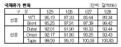 Brent, 1월28일 2.03달러 올라 99.42달러 … WTI는 89.34달러 형성 1월28일 국제유가는 중동 지역의 공급차질 우려 및 미국의 경기지표 호조로 상승했다.한국석유공사에 따르면, 뉴욕상업거래소(NYMEX)의 WTI(서부텍사스 경질유) 선물유가는 89.34달러로 3.70달러, 런던석유거래소(ICE)의 Brent 선물유가는 99.42달러로 2.03달러 올랐다. 두바이(Dubai) 현물유가는 전일대비 0.11달러 상승한 93.44달러에 마감했다.
