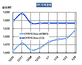 CFR FEA 1525달러로 30달러 상승 … 춘절연휴 이후가 문제 PP 가격은 1월26일 CFR FE Asia 톤당 1525달러로 30달러 상승했다.아시아 PP(Polypropylene) 시세는 중국의 춘절연휴가 구매수요가 줄어들고 있음에도 불구하고 코스트 상승의 영향으로 상승세를 지속했다. 프로필렌(Propylene) 가격이 FOB Korea 톤당 1318달러로 10달러 상승하는 등 코스트 부담이 가중되고 있기 때문이다.