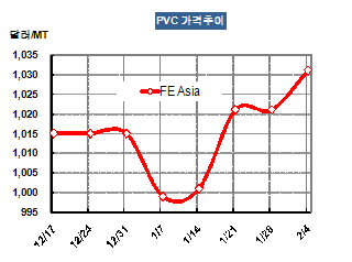 CFR FE Asia 1031달러로 10달러 상승 … 2월 미국산 유입 확실시 PVC 가격은 2월2일 CFR FE Asia 톤당 1031달러로 10달러 상승했다.아시아 PVC(Polyvinyl Chloride) 시세는 한국, 중국, 타이완의 구정 연휴를 맞아 거래가 많지 않았으나 국제유가 강세로 오름세를 나타냈다. 국제유가는 WTI(서부텍사스 경질유)가 배럴당 87.87달러로 상대적으로 약세를 보였으나 전주에 비해서는 크게 상승했고, Brent유는 99.34달러로 2달러 이상 올라 100달러에 육박했다.