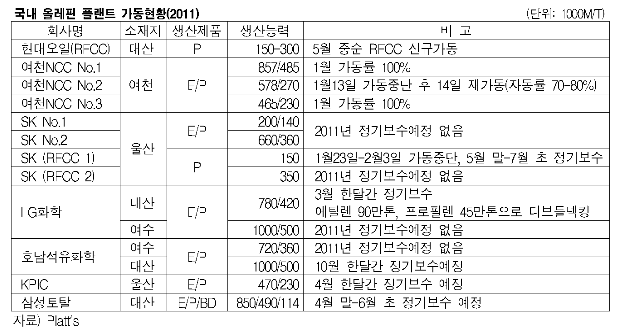 정기보수 적고 현대는 프로필렌 30만톤 가동 … 4-5월 일시적 타이트 국내 올레핀 시장은 신증설과 디보틀넥킹, 일부 국한된 크래커의 정기보수로 수급밸런스가 2011년 상반기 동안 유지될 것으로 예상된다.1월13일 화재로 가동을 중단했던 여천NCC는 이미 정상화돼 No.2 크래커만 3월 말까지 가동률이 70-80%에 머물 뿐 No.1, No.3 크래커는 풀가동하고 있다. 현대오일뱅크는 대산 소재 프로필렌(Propylene) 15만-30만톤 플랜트를 5월 중순부터 가동해 프로필렌 공급을 확대할 예정이다. 여천NCC No.2와 SK(RFCC 1), 삼성토탈도 일시적으로 가동중단 사태를 겪었으나 정상 가동률을 회복하면서 시장에 미친 영향은 미미했던 것으로 판단된다.
