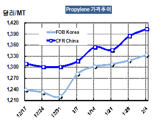 FOB Korea 1333달러로 15달러 올라 … 정기보수 집중 재상승 가능 프로필렌 가격은 2월2일 FOB Korea 톤당 1333달러로 15달러 상승했다.아시아 프로필렌(Propylene) 시세는 이집트의 민주화 요구 소요사태로 국제유가가 100달러에 육박하는 초강세를 보인 영향으로 상승했다. 국제유가는 WTI(서부텍사스 경질유)가 배럴당 87.87달러로 상대적으로 약세를 보였으나 전주에 비해서는 크게 상승했고, Brent유는 99.34달러로 2달러 이상 올라 100달러에 육박했다.
