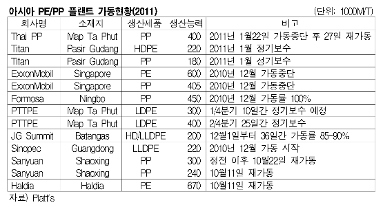 TitanㆍPTTPE 정기보수 … JG SummitㆍSinopec 가동률 낮아 2011년 들어 PEㆍPP 플랜트들이 정기보수 및 재가동을 반복하고 있다.Thai PP는 Map Ta Phut 소재 PP(Polyethylene) 40만톤 플랜트를 1월22일 가동을 중단한 후 27일 재가동했고, Titan Chemical은 Gudang 소재 HDPE((High Density PE) 22만톤 및 PP 18만톤 플랜트를 1월 정기보수에 들어갔다. ExxonMobil은 싱가폴 소재 PE 60만톤 및 PP 40만5000톤 플랜트를 2010년 12월 가동중단했지만, Formosa는 Ningbo 소재 PP 45만 플랜트를 풀가동했다. PTTPE는 Map Ta Phut 소재 LDPE(Low-Density PE) 30만톤 플랜트를 1/4분기에 10일간 정기보수할 예정이고, LDPE 40만톤 플랜트는 2/4분기에 25일간 정기보수를 할 계획이다.