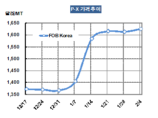 FOB Korea 톤당 1625달러로 12달러 올라 … 미국산 유입이 변수 아시아 P-X 가격은 2월2일 FOB Korea 톤당 1625달러로 12달러 상승했다.구정연휴 동안 거래가 거의 이루어지지 않았기 때문이다. 그러나 시장 관계자들은 폴리에스터(Polyester) 수요증가로 P-X의 원료인 PTA(Purified Terephthalic Acid) 수요가 늘어나고 있어 2월에는 P-X 가격이 상승할 것으로 예상하고 있다. P-X 3월 선적분은 CFR Taiwan/Ningbo 톤당 1640달러에, 중국ㆍ인디아ㆍ중동을 제외한 아시아 지역에서 생산된 P-X는 톤당 1650달러에 거래됐다.