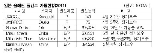 | JXㆍIdemitsu Kosan 잇따라 보수 … Showa Denko는 가동률 70%일본은 2011년 상반기에 올레핀 정기보수가 집중되면서 공급타이트가 예상되고 있다. JX Nippon Energy & Oil은 Kawasaki 소재 프로필렌(Propylene) 14만톤 및 Osaka 소재 프로필렌 7만5000톤의 RFCC를 4월 3주간 정기보수할 예정이다. 또한 Idemitsu Kosan는 Chiba 소재 에틸렌(Ethylene) 37만4000톤, 프로필렌 22만4000톤 크래커를 3-4월, Mitsubishi Chemical은 Mizushima 소재 에틸렌 49만6000톤, 프로필렌 32만톤 크래커를 5월16일부터 6월29일까지 정기보수할 계획이다.