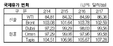 2월17일 1.53달러 올라 99.56달러 형성 … WTI도 86달러로 상승 2월17일 국제유가는 차익실현 매출이 출회되면서 상승했다.한국석유공사에 따르면, 런던석유거래소(ICE)의 Brent 선물유가는 배럴당 102.59달러로 1.19달러 하락한 반면, 뉴욕상업거래소(NYMEX)의 WTI(서부텍사스 경질유)는 매도청산을 위한 매수(Shot-Covering) 유입으로 86.36러로 1.37달러 상승했다. 두바이(Dubai) 현물유가는 중동의 정정불안이 뒤늦게 반영돼 1.53달러 상승한 99.56달러에 거래를 마감했다.