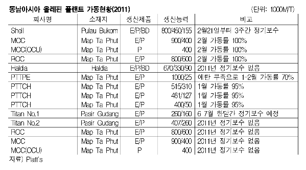 PTTPE·MOC·ROC 2월 100% … Shell은 2월21일 정기보수 2011년 동남아시아 올레핀(Olefin) 가동률이 쾌조를 보이고 있다.PTTPE는 에탄(Ethane) 공급부족으로 Map Ta Phut 소재 에틸렌(Ethylene) 100만톤 크래커를 1-2월 70% 가동했으나 2월 이후 100%로 끌어올릴 예정이다. PTTCH도 Map Ta Phut 소재 I4-1과 I4-2 및 I-1 크래커의 가동률을 1월 95%로 유지했다. ROC는 Map Ta Phut 소재 에틸렌 80만톤, 프로필렌(Propylene) 60만톤 크래커를 2010년 11월 정기보수로 가동을 중단됐으나 12월 재가동 이후 2011년에는 정기보수 계획이 없는 것으로 확인됐다.