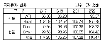 2월22일 3.36달러 올라 103.72달러 … WTI도 7달러 급등해 93달러로 2월22일 국제유가는 리비아 정정불안 지속으로 상승했다.한국석유공사에 따르면, 뉴욕상업거래소(NYMEX)의 WTI(서부텍사스 경질유)는 배럴당 93.57달러로 전일대비 7.37달러 치솟았으며, 런던석유거래소(ICE)의 Brent 선물유가는 105.78달러로 0.04달러 소폭 상승했다. 두바이(Dubai) 현물유가도 3.36달러 급등해 103.72달러로 거래를 마감했다.