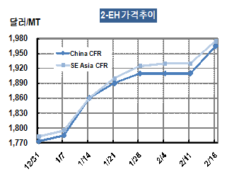 CFR China 1965달러로 50달러 올라 … Nanya 증설에 기대 모아져 2-EH 가격은 2월17일 CFR China 톤당 1965달러로 50달러 급등했다.아시아 2-EH(Ethylhexanol) 시세는 국제유가가 배럴당 100달러에 육박했고 프로필렌(Propylene) 가격이 전주대비 17달러 상승해 FOB Korea 톤당 1401달러를 형성한 영향으로 2000달러를 향해 돌진하고 있다. 중국의 DOP(Dioctyl Phthalate) 생산기업은 구매가격을 CFR China 톤당 1910달러에서 1950달러로 높여 제시했음에도 2-EH를 공급받지 못한 것으로 알려졌다. 수급이 타이트한 상태에서 한화케미칼, Kyowa Hakko, Mitsubishi Chemical 등이 정기보수를 위해 재고를 확보하고 잇기 때문으로 분석된다. 시장 관계자는 “3사의 생산능력은 약 36만5000톤으로 시장에 미치는 영향이 작지 않아 중국가격을 500위안 오른 톤당 1만5500위안으로 끌어올렸고 1만5700위안을 요구하는 곳도 나오고 있다”고 밝혔다.