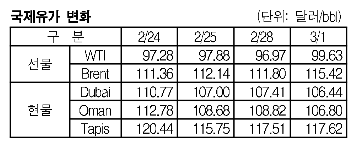 3월1일 3.62달러 올라 115.42달러 형성 … 두바이유도 106달러 3월1일 국제유가는 정정불안 고조 및 석유 수요 증가 전망 등의 영향으로 상승했다.한국석유공사에 따르면, 뉴욕상업거래소(NYMEX)의 WTI(서부텍사스 경질유)는 배럴당 99.63달러로 전일대비 2.66달러, 런던석유거래소(ICE)의 Brent 선물유가는 115.42달러로 3.62달러 상승했다. 반면, 두바이(Dubai) 현물유가는 전일대비 0.97달러 내린 106.44달러에 거래를 마감했다.