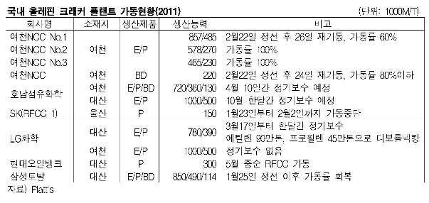 국내 올레핀(Olefin) 시장은 크래커 증설과 디보틀넥킹, 정기보수가 적절히 예정돼 수급밸런스가 유지될 전망이다. 여천NCC No.1과 삼성토탈, SK는 일시 가동중단 상태에서 벗어나 100%에 정상가동률을 회복하면서 수급의 차질을 줄이고 있다. 여천NCC는 2월20일 정전으로 No.1 에틸렌(Ethylene) 크래커를 잠시 가동 중단했지만 26일부터 정상가동을 시작해 2월 말 60%의 가동률을 보이고 있지만 No.2와 No.3은 100% 가동하고 있다. 여천NCC는 부타디엔(Butadiene) 22만톤 플랜트도 2월22일 정전으로 가동 중단한 후 2월24일 재가동해 80% 정도의 가동률을 보이고 있다. 삼성토탈은 대산 소재 에틸렌 85만톤, 프로필렌(Propylene) 49만톤 크래커 및 부타디엔 11만4000톤 플랜트를 1월25일 정전으로 가동을 중단했으나 현재는 거의 100% 가동하고 있다. LG화학은 대산 소재 에틸렌 78만톤, 프로필렌 42만톤 크래커를 3월17일부터 한달간 정기보수와 디보틀넥킹으로 생산능력을 에틸렌 90만톤, 프로필렌 45만톤으로 각각 확대할 예정이다. 여수 소재 에틸렌 100만톤, 프로필렌 50만톤 크래커는 정기보수 계획이 없는 것으로 알려졌다. 호남석유화학도 여수 소재 에틸렌 72만톤, 프로필렌 36만톤 크래커 및 부타디엔 13만톤 플랜트를 4월 10일간, 대산 소재 에틸렌 100만톤, 프로필렌 50만톤 크래커는 10월 한달간 보수할 계획이다. 한편, 현대오일뱅크는 대산 소재 프로필렌 생산능력 15만-30만톤의 RFCC를 5월 중순부터 가동해 프로필렌 공급을 본격화할 예정이다. <이아란 기자>