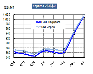 나프타 가격은 3월4일 C&F Japan 톤당 1017달러로 68달러 폭등했다. 아시아 나프타(Naphtha) 시세는 국제유가가 배럴당 110달러를 넘어섬에 따라 1000달러를 돌파해 30개월만에 최고치를 기록했다. 국제유가는 Brent유가 배럴당 116달러에 근접하고 두바이(Dubai)유도 110달러를 넘어서는 등 초강세를 지속하고 있다. WTI(서부텍사스 경질유) 역시 8달러 가까이 급등해 104달러를 넘어섰다. 아시아 나프타 시세는 국제유가가 120달러에 도달하면 1050달러를 넘어서 1100달러를 넘어설 가능성 제기되고 있다. Cargill이 5월 상순 도착물량을 1002달러에 구매하는 등 나프타 구매에 적극 나서고 있기 때문이다. 다만, 유럽의 나프타 가격이 CIF ARA 톤당 999.5달러에 머물러 다시 하락세로 전환될 가능성도 나타나고 있다. <화학저널 2011/03/07> |