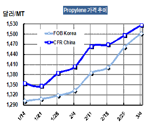 프로필렌 가격은 3월4일 FOB Korea 톤당 1501달러로 40달러 상승했다.
