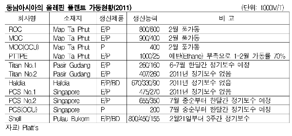 표, 그래프: < 동남아시아의 올레핀 플랜트 가동현황(2011) > <화학저널 2011/03/09> |