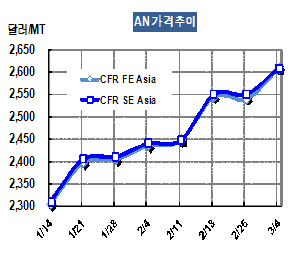 아시아 AN 가격은 3월4일 CFR FE Asia 톤당 2610달러로 70달러 급등하면서 2011년 들어 최고치를 갱신했다.