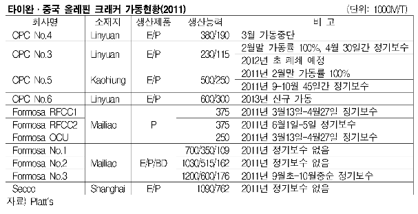 표, 그래프: < 타이완․중국 올레핀 크래커 가동현황(2011) > <화학저널 2011/03/10> |