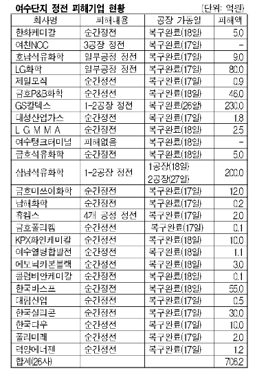 여수단지에 입주한 26사는 순간 전압강하의 영향을 받아 전압에 민감한 일부 설비의 가동이 중단되는 부분 정전이 일어났다.