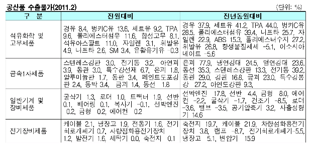 표, 그래프: < 공산품 수출물가(2011.2) > <화학저널 2011/03/15> |