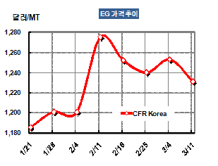 MEG 가격은 3월9일 CFR Korea 톤당 1231달러로 22달러 하락했다.