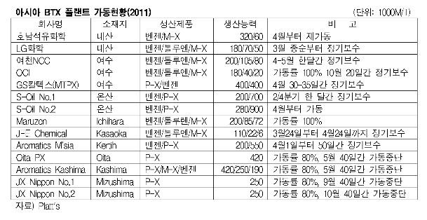 표, 그래프: < 아시아 BTX 플랜트 가동현황(2011) > <화학저널 2011/03/15> |