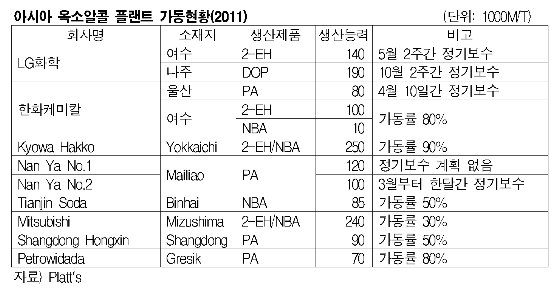 표, 그래프: < 아시아 옥소알콜 플랜트 가동현황(2011) >