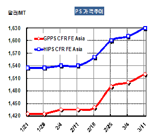 아시아 PS(Polystyrene)가격은 3월9일 CFR China 톤당 1520달러로 20달러 상승했다. PS 시장 관계자는 “PS 가격 상승으로 수요기업들이 가격이 떨어질 때까지 구매를 미루고 있는 상황”이라고 밝혔다.