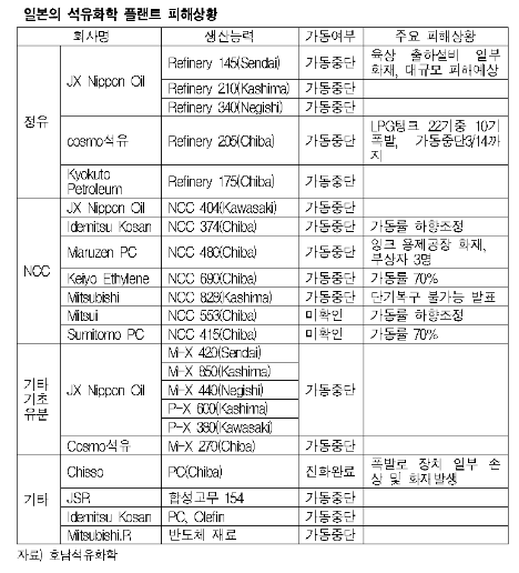 표, 그래프: < 일본의 석유화학 플랜트 피해상황 > <화학저널 2011/03/16> |