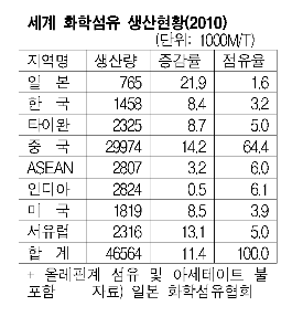 표, 그래프: < 세계 화학섬유 생산현황(2010) > <화학저널 2011/03/16> |