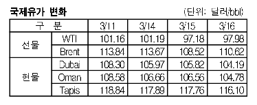 3월16일 1.63달러 내려 104.19달러 … Brent유는 110.62달러로 상승