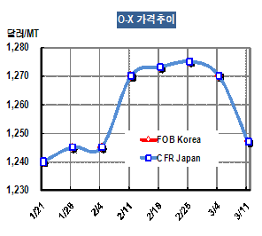 아시아 O-X(Ortho-Xylene) 가격은 3월11일 FOB Korea 톤당 1247달러로 23달러 하락했다.