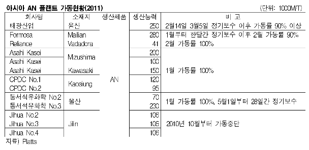 표, 그래프: < 아시아 AN 플랜트 가동현황(2011) > <화학저널 2011/03/17> |