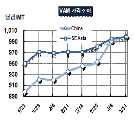 아시아 VAM(Vinyl Acetate Monomer) 가격은 3월10일 CFR China 톤당 999달러를 형성하며 1000달러 돌파를 목전에 두고 있다.