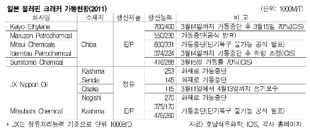 표, 그래프: < 일본 올레핀 크래커 가동현황(2011) > <화학저널 2011/03/18> |