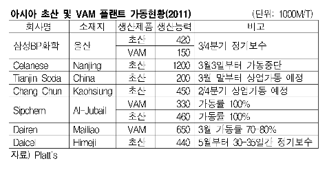 표, 그래프: < 아시아 초산 및 VAM 플랜트 가동현황(2011) > <화학저널 2011/03/21> |