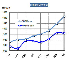 톨루엔 가격은 3월18일 FOB Korea 톤당 1077달러로 41달러 급등했다.