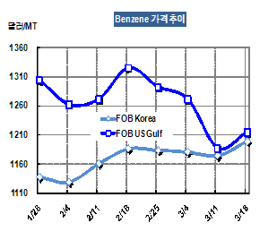 벤젠 가격은 3월18일 FOB Korea 톤당 1199달러로 25달러 상승했다.