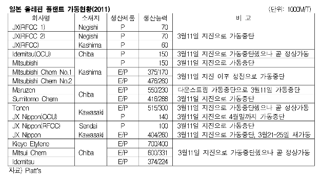 일본 올레핀(Olefin) 시장은 2011년 3월11일 동북부 지진과 상반기 계획된 정기보수로 수급타이트가 극심할 전망이다.