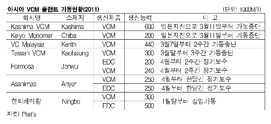 아시아 VCM(Vinyl Chloride Monomer) 시장이 일본 지진여파와 정기보수 집중이 맞물리며 수급타이트가 최고조에 달할 전망이다.