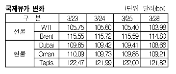 3월28일 0.75달러 내려 108.66달러 형성 … WTIㆍBrent도 소폭 하락