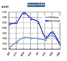 벤젠 가격은 3월25일 FOB Korea 톤당 1149달러로 50달러 급락했다.