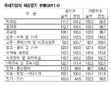 표, 그래프: < 국내기업의 체감경기 현황(2011.4) > <화학저널 2011/03/30> |