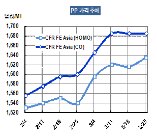 PP Injection 가격은 3월23일 CFR FE Asia 톤당 1635달러로 19달러 상승했다.