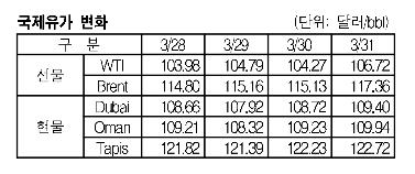 3월31일 0.68달러 올라 109.40달러 형성 … WTIㆍBrent도 상승