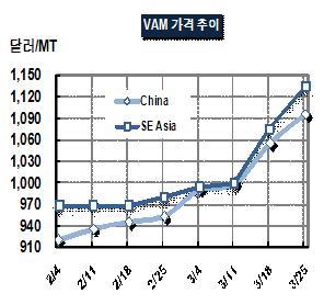 아시아 VAM 가격은 3월24일 CFR China 톤당 1095달러로 40달러 상승하며 1100달러 돌파를 눈앞에 두고 있다.
