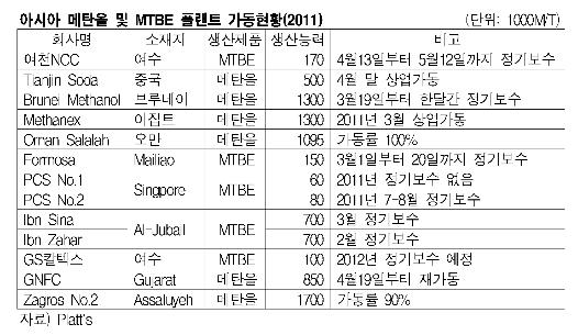 표, 그래프: < 아시아 메탄올 및 MTBE 플랜트 가동현황(2011) > <화학저널 2011/04/01> |