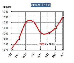 에틸렌 가격은 4월1일 FOB Korea 톤당 1331달러로 20달러 상승했다.