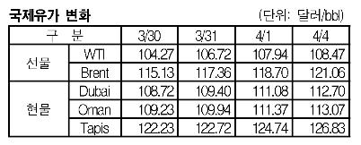 Brent, 4월4일 2.36달러 올라 121.06달러 형성 … 두바이유는 112.70달러