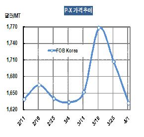 P-X 가격은 4월1일 FOB Korea 톤당 1632달러로 75달러 폭락했다.