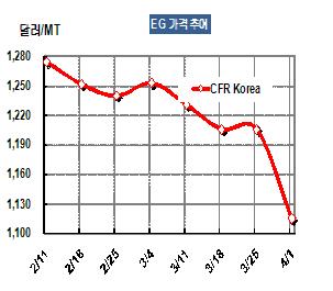 MEG 가격은 4월1일 CFR China 톤당 1115달러로 91달러 폭락했다.