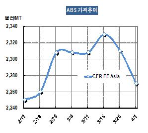 ABS 가격은 3월30일 CFR FE Asia 톤당 2270달러로 40달러 하락했다.