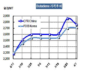 특히, 중국에서 부타디엔 공급이 늘어나고 수요가 줄어들고 있다. 표, 그래프: < Butadiene 가격추이 > <화학저널 2011/04/07> |